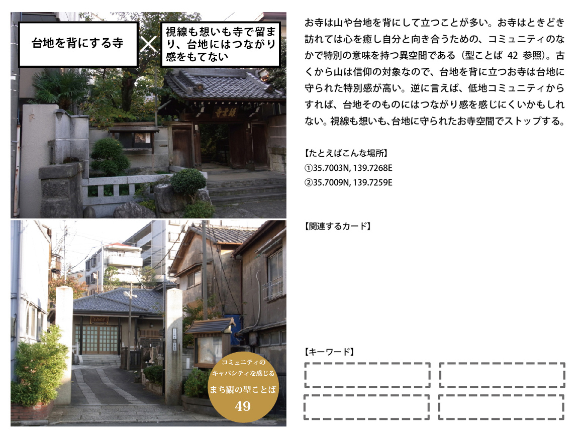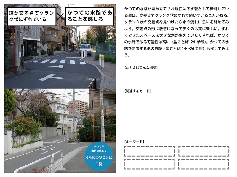 まちを歩いてまちの雰囲気に浸るだけでは飽き足りない二人の教員が,ある日,かつての水路(品川用水)の痕跡を発見してしまったことをきっかけに,まちを観てコミュニティーの成り立ちの今昔に想いを馳せる(一種の)コツ集を制作してしまいました.われわれはそれを「まち観の型ことば」と呼んでいます.まちを観る見方であり,まちを語ることばでもあるという意味の呼称です.現在49個の型ことばができあがっています.