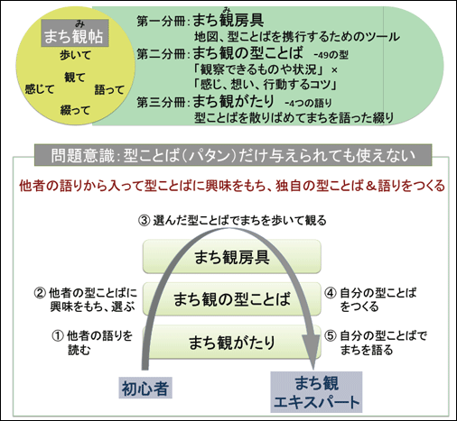 というわけで,まち観帖は,まち観房具,まち観の型ことば,まち観がたりの3つコンポーネントからなります.われわれは「他者のまち観がたりから入って,型ことばに興味を抱き,しだいに自分の型ことばとまち観がたりを手に入れる」という感性学習方法論をつくったのだと思っています.(「まち観帖の手引き」を参照).