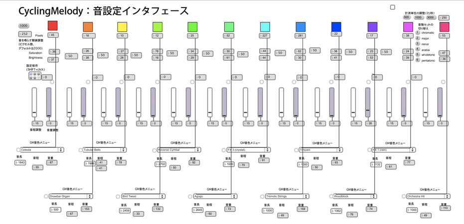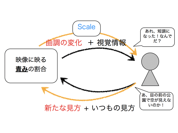 CyclingMelodyは、音の変化をきっかけとして、風景の色変化や風景を構成するものの感覚・感覚を促し、 自分の感覚に合う音を模索して調整し続ける中で自分の感覚と風景の関係を探究を促します。
