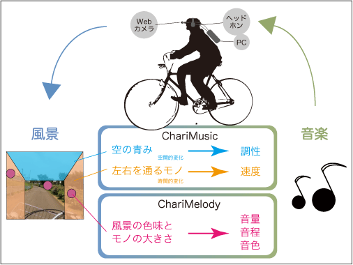 この研究は、視覚とは異なるチャンネルを通して、普段は気付かない風景の微妙な変化を知覚できるようにすることを目的としています。現在、ChariMusicとChariMelodyという2つのツールを開発し、実践を行っています。
