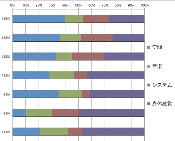 開発したツールを使用しながら自転車で走る実践実験を行っています。 乗車後に実践を通して考えたこと/感じたこと/気付いたことなどを日記のように書いています。 この文章データをを元に、実践者の知覚がどのように変化しているかを分析しました。 ひとつは、空間ー音楽ーシステムー身体感覚という分類に対して、意識の向きがどのように変化しているか。 短期間のデータですが、徐々に身体感覚に関する言葉が増えていることがわかります。 もうひとつは、変数種類数(着目したモノの種類)の変化です。 こちらは実践を継続している中で、着目できるモノが増えて行っていることがわかります。