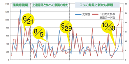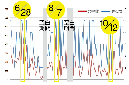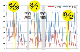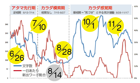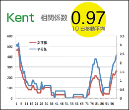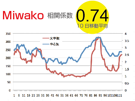 そのような新たな関係性を有した場で、3人の関心の共通項が「やる気」である、ということに気づきました。そこで、やる気とメタ認知的言語化に関係性が見出せるかどうか検証することにしました。その時点で蓄積された5ヶ月分の日記データを自ら振り返り、主観的評価により5段階のやる気得点をつけ、やる気を可視化しました。そのやる気得点と日記の文字数の関係を調べると、Miwako(腰割り)0.74, Kent(サーフィン)0.97, Bibi(ヨガ)0.80と極めて高い相関がみられました。この結果を用い、日記の文字数≒やる気という従属変数と捉え、従属変数そのものの意味に、また影響を与える要因(変数)等について相互に言語化を繰り返していきました。