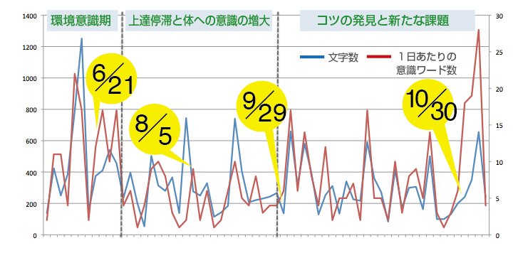 その結果、変数の数値化・グラフ化を通じて、腰割りでは、新たな身体部位言語の獲得とやる気の関係性、サーフィンではコツの発見と意識の変化、ヨガでは生活リズムと日記空白期間の関係性などの気づきがありました。また、言語化する言葉の中にも、メンバーの発する言葉に影響を受けるものが増えていったことも明らかになりました。